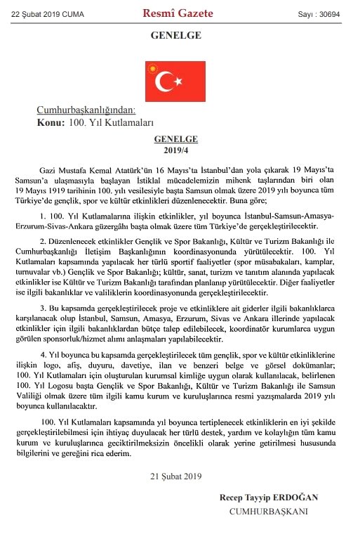 Cumhurbaşkanlığından 19 Mayıs’ın 100. Yılı Kutlamaları Genelgesi